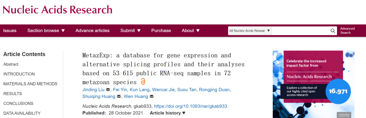 黄水清教授课题组研制完成后生动物基因表达和可变剪接数据分析平台(//bioxinhaotddc.com/metaExp),成果“MetazExp: a database for gene expression and alternative splicing profiles and their analyses based on 53 615 public RNA-seq samples in 72 metazoan species”在生物信息学领域权威期刊Nucleic Acids Research(IF=16.9)在线发表。