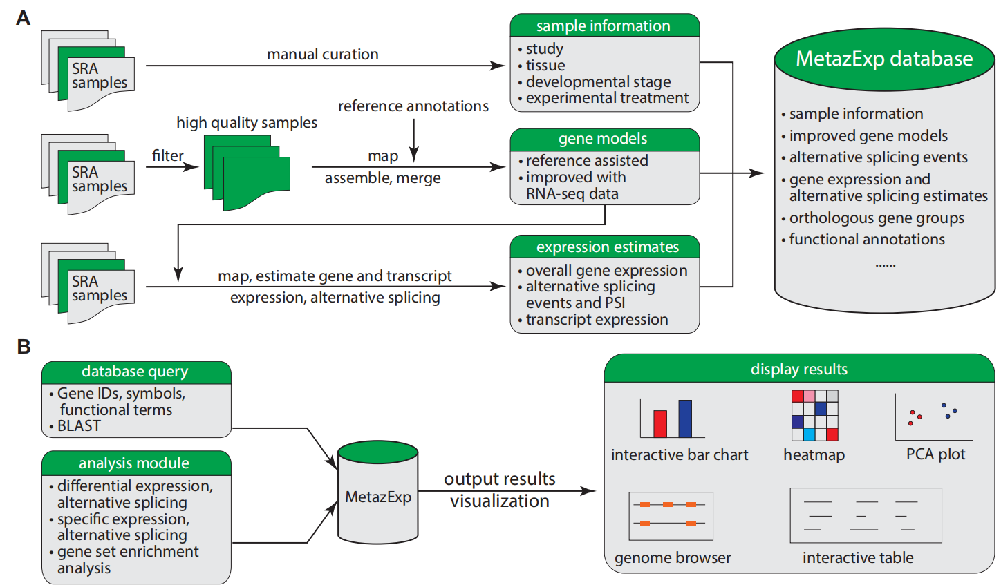 为消除生物学研究人员和大数据之间的沟渠,提升公共数据的利用率,该团队将情报学的数据采集、信息组织、领域知识挖掘方法应用于生物信息领域。以72种后生动物为对象,全面搜集整理了对应的53 615个测序数据,对样品品系、基因型、组织、发育阶段、处理条件等重要生物学属性进行了标注,开发pipeline优化基因模型、识别可变剪接事件、完善基因组注释,并对测序样本中基因表达和可变剪接水平分别在多个层次上进行定量。在此基础上,开发了具有检索和在线分析功能的平台,可自动生成各种实用图表,以便科研人员获得有意义的生物学见解,为深入研究相关基因功能提供有价值的参考。