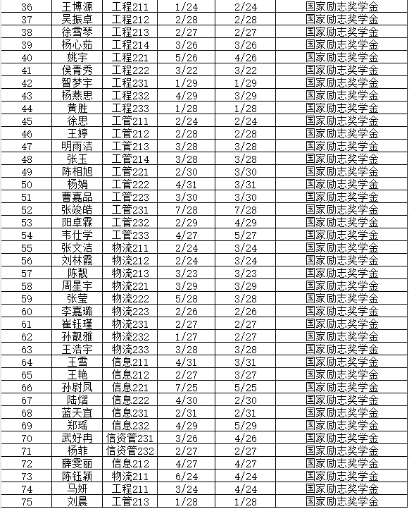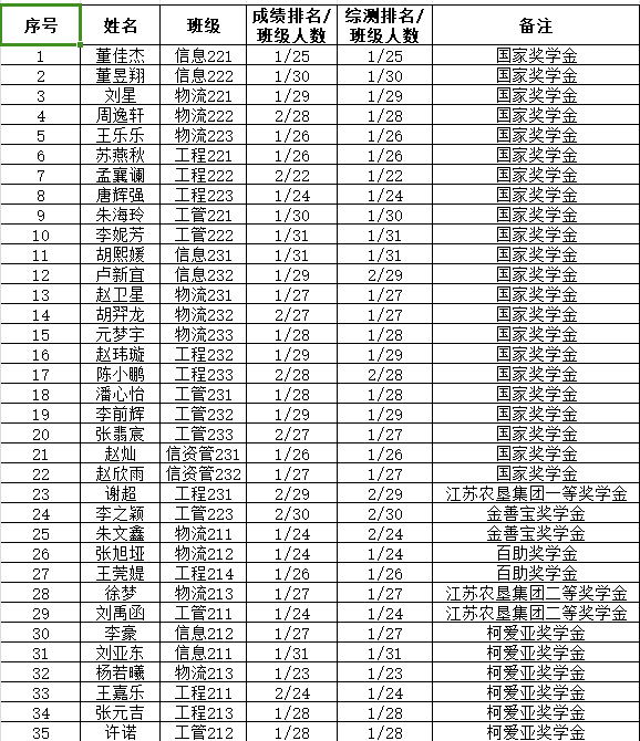 经班级推荐、学院奖助学金评定小组投票选举等环节,推荐董佳杰等22名同学获得国家奖学金,谢超等1名同学获得江苏农垦集团一等奖学金,李之颖等2名同学获得金善宝奖学金,张旭垭等2名同学获得百助奖学金,徐梦等2名同学获得江苏农垦集团二等奖学金,李豪等6名同学获得柯爱亚奖学金,王博源等40名同学获得国家励志奖学金。现公示如下: