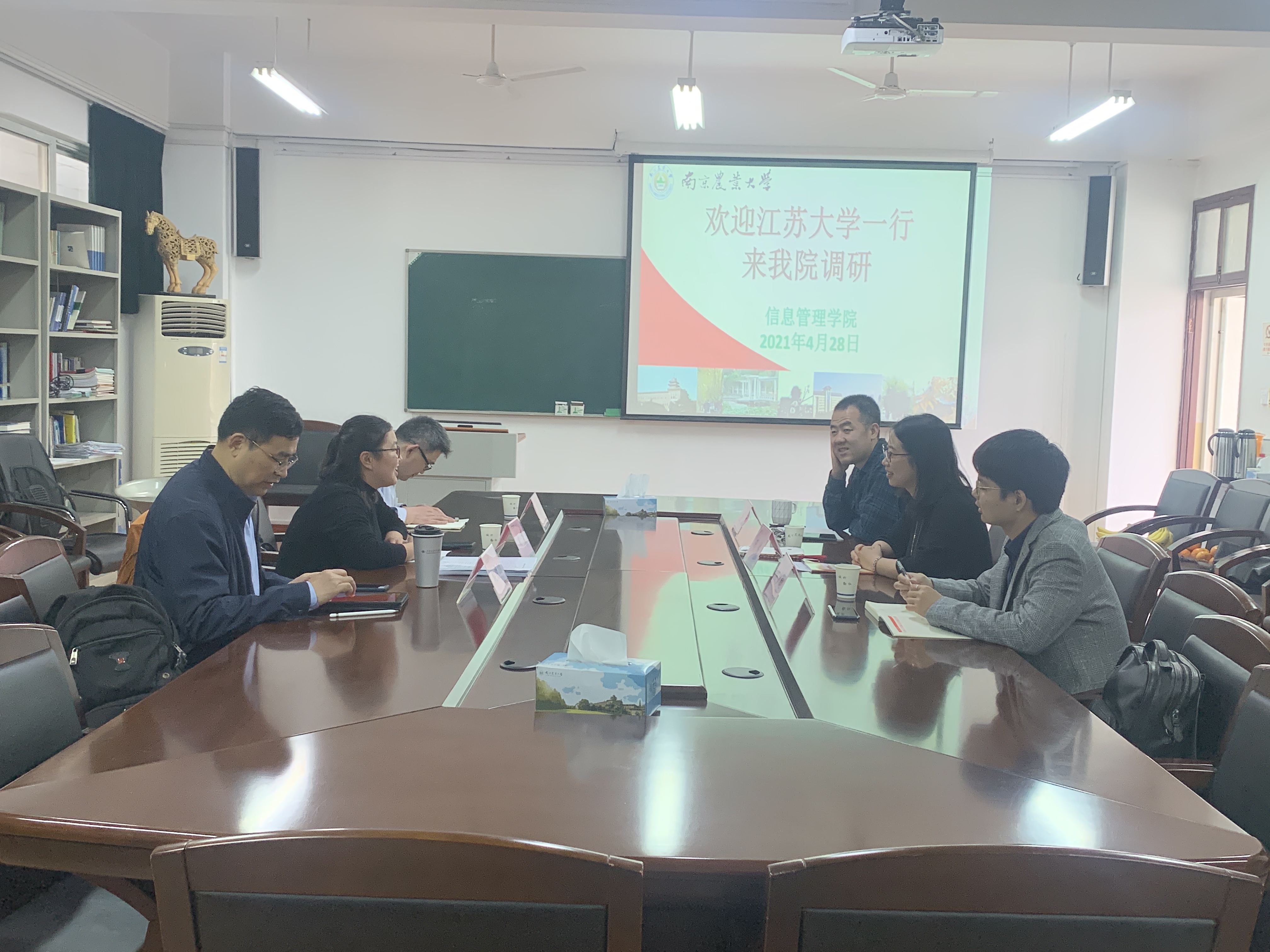 2021年4月28日下午,江苏大学图书馆张晓阳副馆长、刘竟副馆长及科技信息研究所刘桂锋所长来新濠天地赌场 交流。新濠天地赌场 何琳副院长、信息管理科学系付少雄主任及杨波教授参加交流研讨。何琳副院长主持会议。