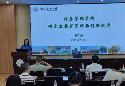 副院长何琳作“研究生教育管理与创新思考”报告,她从学科点设置、研究生规模与培养模式、导师规模与队伍建设、生源质量等方面介绍了学院研究生教育的工作现状,从基本办学条件、基地与实验室、导师队伍、标志性成果、招生数量等方面分析了存在问题,围绕研究生课程建设、生源质量提升、导师队伍建设、科学研究和社会服务平台建设等方面交流了下一步工作打算。