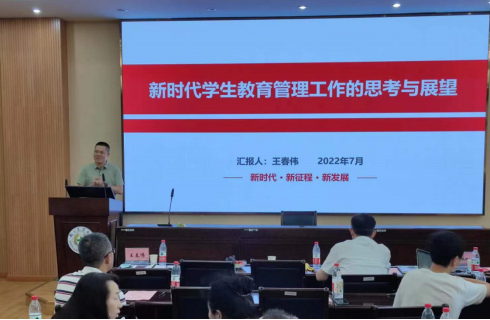 院党委副书记王春伟作“新时代学生教育管理工作的思考与展望”报告,他首先介绍了学院全面推进“三全育人”实施方案的主要内容,随后从“一目标、三育人、四保障、五重点”等方面阐述了学院学生工作的规划与设想。