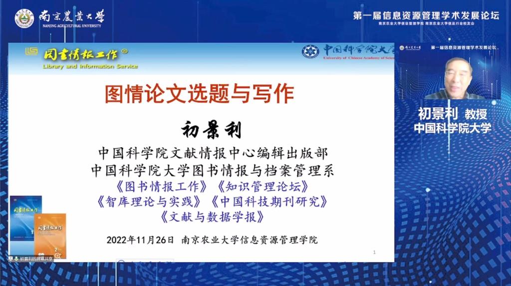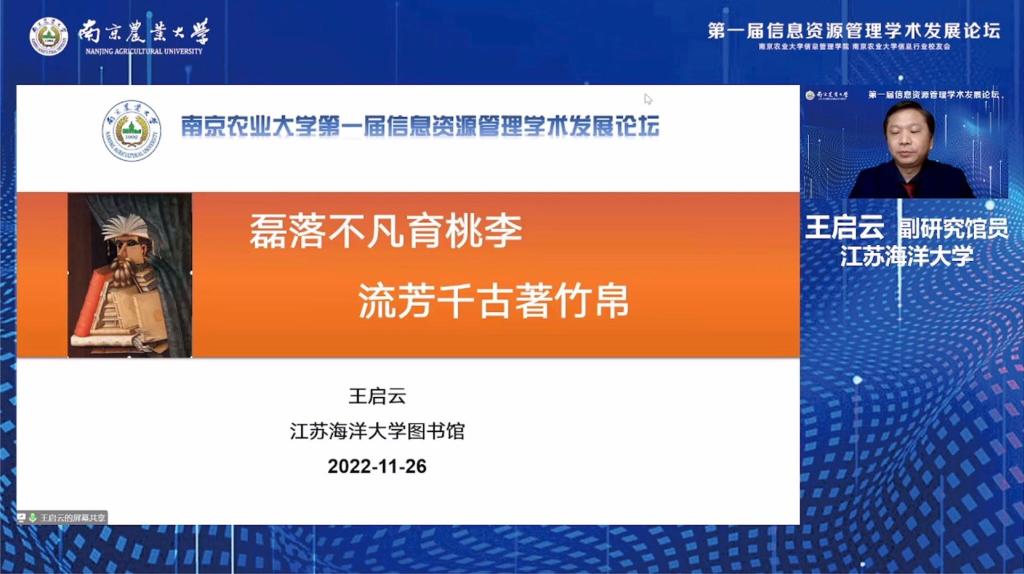 、信息行业校友会主办的第一届信息资源管理学术发展论坛在南京以线上线下相结合的方式举行,来自中国科学院大学、南京大学、同济大学、华东师范大学等单位的专家学者与南农历届信息行业校友共同聚首,就信息资源管理领域热点及前沿议题展开热烈讨论。