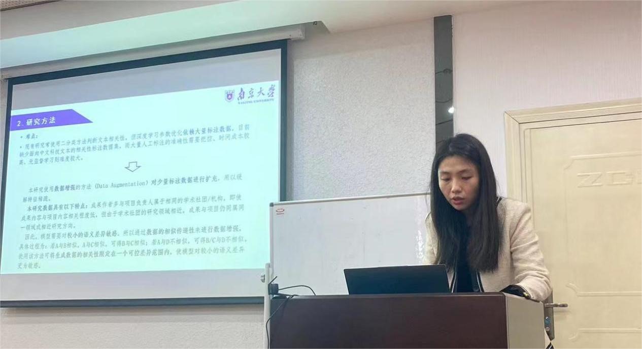 梁继文、南京工业大学图书馆王雪、中国科学院大学于倩倩、华东师范大学经济与管理学部信息管理系楼雯、东南大学图书馆常娥5位南农信息行业校友分别以“科技项目及其成果文献的相关性评估研究”“科学数据重复使用的学科差异性研究”“科技文献中机构名称规范的研究与实践综述”“计算机视觉研究行为模式的动态主题建模分析”“基于深度学习模型的古诗词地名自动识别研究——以金陵古诗词为例”为题进行汇报,南京大学新濠天地赌场