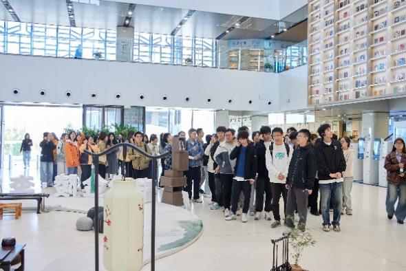 跟随者工作人员的细致讲解,师生们踏入南京江北图书馆的那一刻,立即被大厅内四面巍峨矗立的巨型书墙所吸引,这些书墙不仅是知识的宝库,更是心灵的栖息地,为在场的每一位师生带来了视觉与心灵的双重震撼。大厅里,集借阅、导航、互动问答、信息咨询等多功能于一身的智能化机器人,以及全国首屈一指的智能立体轨道分拣系统,共同展现了图书馆智慧服务的未来图景。师生们亲眼见证了科技与文化融合的魅力,深刻感受到了江北图书馆在提升公共文化服务水平方面的探索与成就。