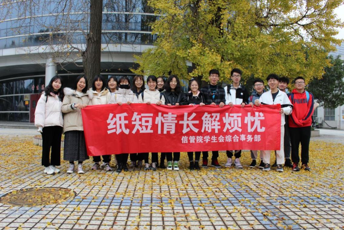 活动中,综合事务部工作人员分工明确,积极热情的为参与活动的同学介绍活动内容,并帮助他们参加活动。参与者按照指引,有序的报名,领取自己喜欢的信封。在领取信封后,同学们可在规定时间内写下自己的烦恼忧愁交于信管院学生会办公室处,同时领取他人的信封进行解答。在为期三天的时间里,同学们可对他人的问题进行解答。解答完成后,综合事务部工作人员组织参加生活类的同学们交换取回自己的信封,并以QQ官方号的形式发表优秀学长学姐们对有代表性的学习类问题的解答,至此活动圆满结束。