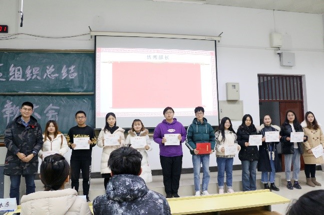 会议的最后进行了表彰颁奖仪式。四位辅导员老师为优秀部长、优秀副部长、优秀学员、金牌编辑、金牌记者、金牌设计颁发了获奖证书。在老师和获奖同学合影留念后,本学期学生组织总结表彰大会在大家热烈的掌声中圆满结束。