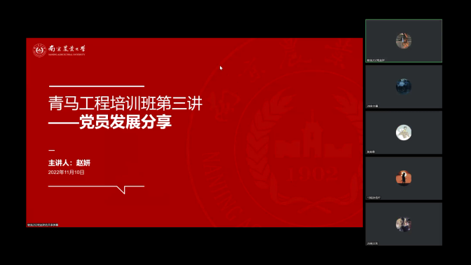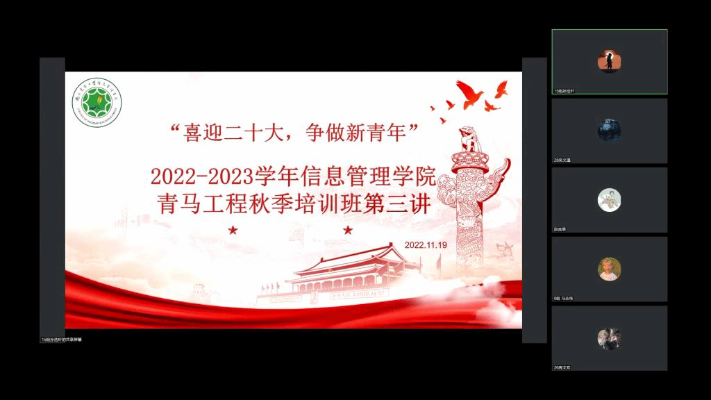 新生学生干部对团员、党员的认识以及公文写作能力,11月19日“青马工程”秋季培训班第三次培训会线上会议如期举办。会议由团委副书记段其萌、党建班副班长赵妍和学生组织办公室主任黄志恒主讲,新濠天地赌场