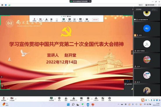 赵开堂老师围绕深刻把握党的二十大主题及主要成果、深刻把握过去5年的工作和新时代10年的伟大变革、深刻把握开辟马克思主义中国化时代化新境界的历史责任、深刻把握以中国式现代化推进中华民族伟大复兴的使命任务、深刻把握全面建设社会主义现代化国家的目标任务、深刻把握坚持党的全面领导和全面从严治党、深刻把握应对风险挑战等七个方面进行了宣讲和阐述。